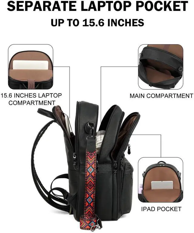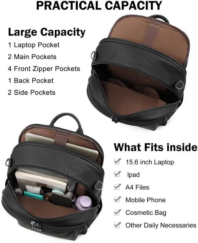 Independent Laptop Compartment:This leather laptop backpack is designed with a dedicated padded compartment to securely hold laptops up to 15.6 inches, keeping your device protected from bumps and scratches. Multiple interior pockets of varying sizes are perfect for organizing essentials like notebooks, chargers, and headphones. The large top zippered opening allows for quick and hassle-free access to your laptop without disturbing other items, making it ideal for work, school or travel