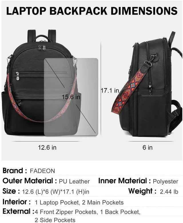Large Capacity Backpack: Designed for maximum organization, this womens laptop backpack includes 13 functional pockets: 2 main compartments, 1 15.6 inch padded laptop pocket, 4 front zippered pockets, 2 side pockets for water bottles, and a secure anti-theft pocket on the back. Inside, you'll find 1 zippered pocket and 2 slip pockets for smaller essentials. Measuring 12.6"L x 6"W x 17.1"H and weighing 2.44 lbs, it's perfect for carrying A4 files, tablets, books, and daily necessities