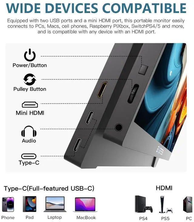 • Effortless Plug-and-Play: Compatible with multiple devices through USB-C and HDMI inputs, this portable monitor connects seamlessly with laptops, gaming consoles, smartphones, tablets, and more. It offers true plug-and-play functionality without the need for extra drivers or complex setup