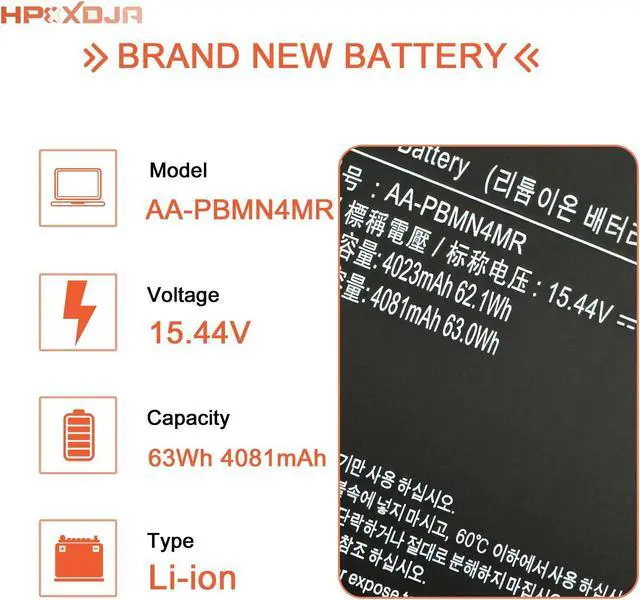 BATTERY SPECIFICATIONS: AA-PBMN4MR battery for Samsung; Battery Type: Li-ion; Capacity: 63 Wh 4081 mAh; Voltage: 15.44 V; WHAT YOU GET? 1 * AA-PBMN4MR battery; 1 * User Manual; 4 *Screwdrivers