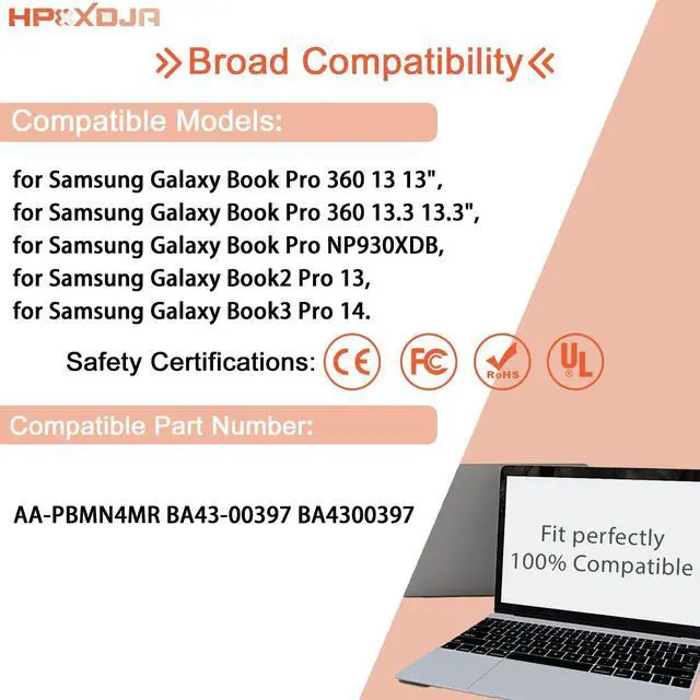 COMPATIBLE WITH: AA-PBMN4MR battery; for Samsung Galaxy Book Pro 360 13 13"; for Samsung Galaxy Book Pro 360 13.3 13.3"; for Samsung Galaxy Book Pro NP930XDB; for Samsung Galaxy Book2 Pro 13; for Samsung Galaxy Book3 Pro 14