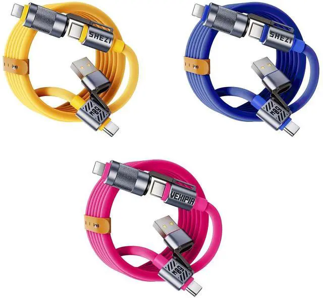Vexipia 3 Pack 4-in-1 5FT 60W USB C Cable Lightning Cable (Yellow + Pink+Blue)