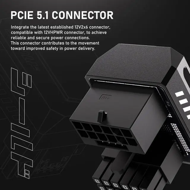 Adopts a 12V2x6 specification connector that is also compatible with the 12VHPWR connector, ensuring full contact for safe current delivery, improving safety in power delivery.