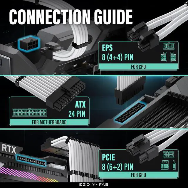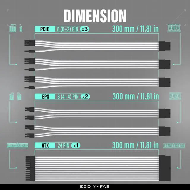 EZDIY-FAB PSU Cable Extension Kit, 16AWG Power Supply Extension Cable, 1x24Pin/2x4+4 EPS/3x6+2 PCI-E, Custom PC Sleeve Cable 300MM with Combs-White