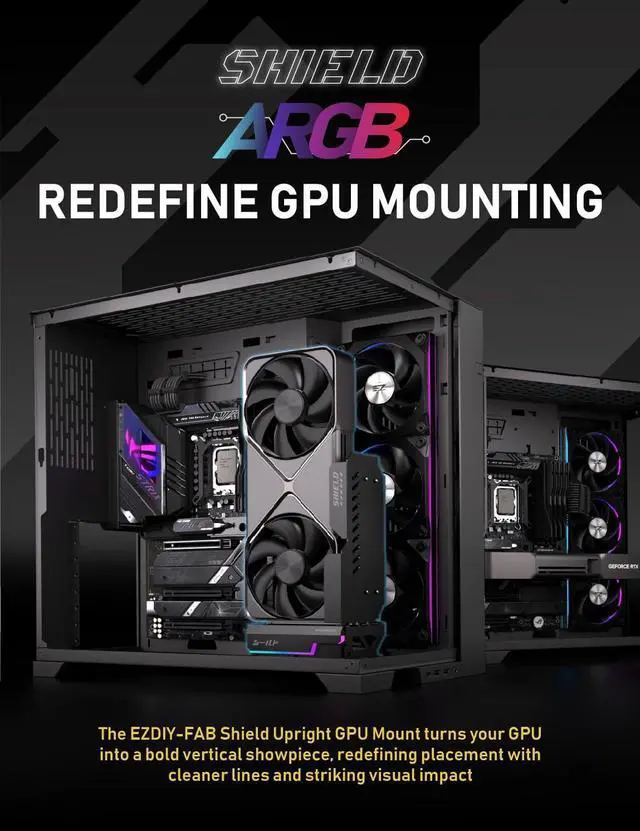 Shield-Inspired Aesthetic]: Built with the bold geometry and robust style of the Shield Series, the Upright GPU Mount features a clean, angular profile that adds a touch of armored elegance to your builddelivering visual impact while maintaining balance in overall system design. ^^ [ Showcase Your