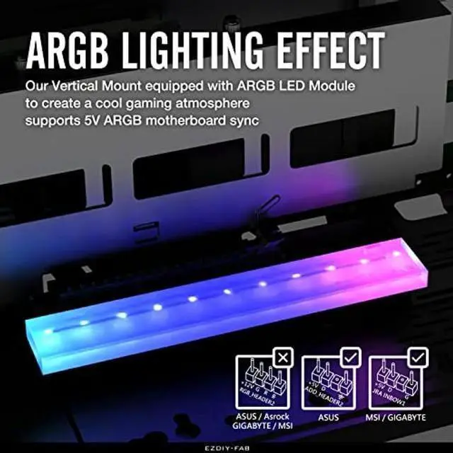 New designed bracket to vertically show off GPU. Supports most 1, 2, and 3 slot graphic cards. Designed for most full/mid ATX tower with at least 7 available PCI slots. ^^ High quality material increases structural toughness and supports the large graphics card weight on the market. Beautiful metal surface treatment, installed in the chassis to form a beautiful landscape. ^^ Vertical GPU Bracket with ARGB LED lighting effects, Synchronizable ARGB lighting via motherboard (AURA, Mystic, Fusion): Support M/B 3 Pin ARGB Header (5V, D, G), Please