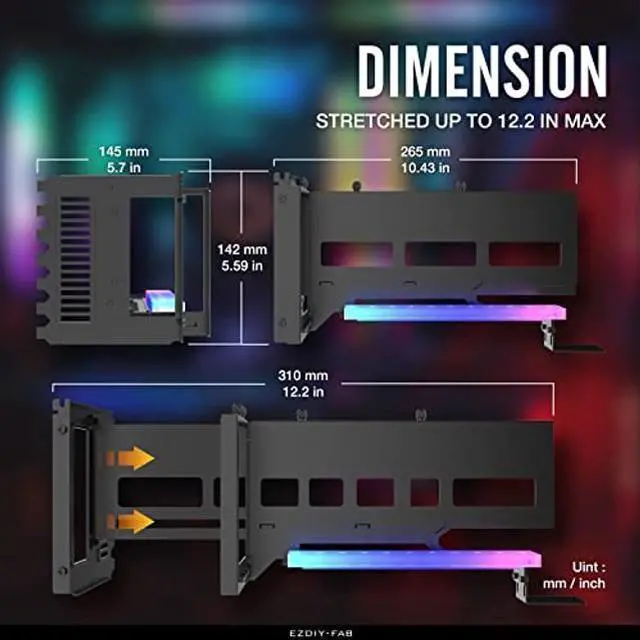 note: Not Support 4pin RGB header (+12V, G, R, B), 12 volts can destroy LED. ^^ Thanks to Stretchable Structure design, you would be able to connect HDMI, DP cable to your GPU without hassle, compatible to PC chassis with PCI grilles. ^^ Please test the riser cable onto the GPU first before installing the GPU to vertical bracket mount. / Please refer to length spec image and confirm that there is enough space of your chassis. ^^ Supports PCIE 4.0 / 3.0 / 2.0 / 1.0, Compatible with RTX3090, RTX3080, RTX3070, RTX3060TI, RX6900XT, RX6800.