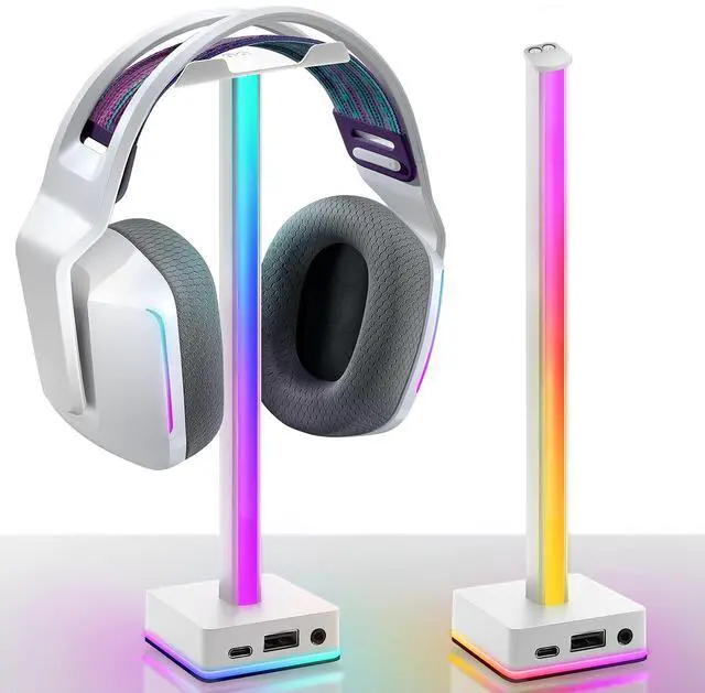 Note: when you place the stand on the desk please be sure the desk is flat and dust free. ^^ Our Headset Holder or Backlight Stand provides 50 lighting modes to create a cool gaming atmosphere. One button to change the light modes and turn off the light(by holding the button for 3-sec). ^^ Compact base of the stand doesn't occupy space of the desk, needs to be used with a PU pad to ensure a stable standing. The PU pad is sticky, it is not recommended to move the stand multiple times after the PU pad is attached. ^^ The USB A and C port of the stand can transfer data by USB 2.0 speed for keyboard, U disk and mouse; aslo charging your devices. Plug and play, compatible with Win 2000, Win XP, WIN 7, WIN 8, WIN 10 and other operating systems; Built in 3.5 mm AUX port enables multi audio experience, brings full range stereo or 7.1 surround sound, Audio function access easily. ^^ The stand are compatible with multiple operating systems. The over-ear headphones are universally compatible, desktop PC/ computer, laptop, tablets, mobile