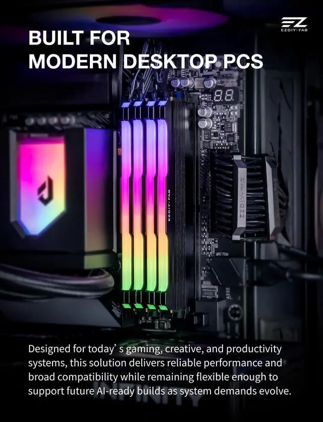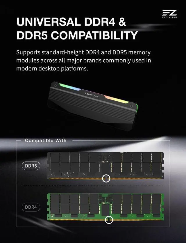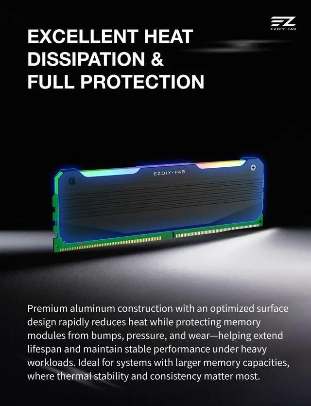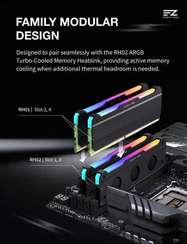 Built for Modern Desktop PCs Ideal for todays gaming, creative, and productivity systems, delivering reliable performance and broad compatibility while remaining flexible enough to support future AI-ready builds as system demands evolve. ^^ Family Modular Design Designed to pair seamlessly with the RH02 ARGB Turbo-Cooled Memory Heatsink, allowing users to add active memory cooling when additional thermal headroom is needed. ^^ Broad DDR4 & DDR5 Compatibility Compatible with a wide range of standard-height desktop DDR4 and DDR5 memory modules, offering versatile fit and long-term upgrade flexibility. ^^ Excellent Heat Dissipation Premium aluminum construction with an optimized surface design rapidly reduces heat, helping keep memory modules stable during extended gaming, creative work, and heavy multitasking.