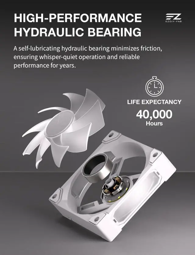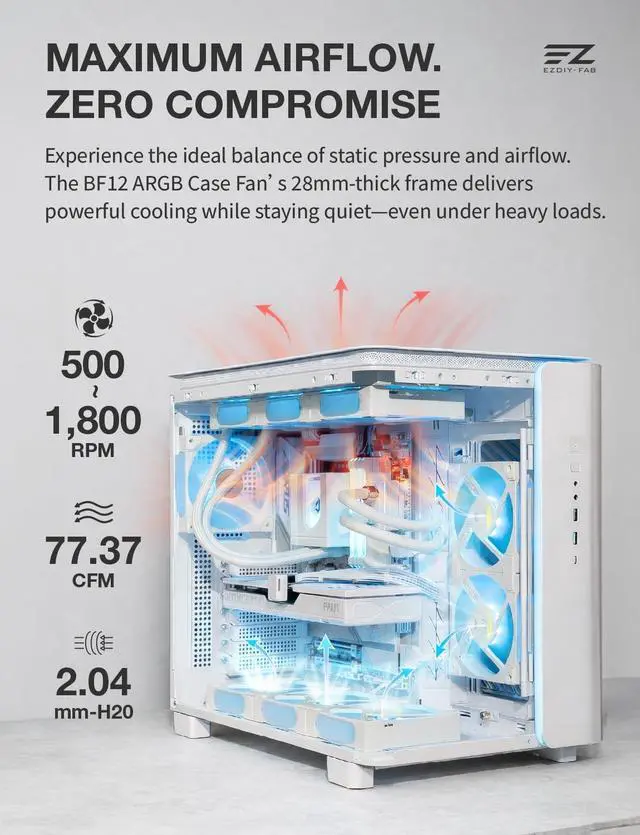 One-Piece AIO Fan Array All-in-one 120/240/360mm fan unit uses one cable and fewer screws for faster installs, cleaner builds, and zero cable clutter ^^ 28mm High-Static Pressure Design Extra-thick 28mm frame delivers powerful airflow with 5001, 800 RPM, up to 77.37 CFM, and 2.04 mm-HO pressure for superior radiator and case cooling. ^^ Quiet Hydraulic Bearing Premium self-lubricating hydraulic bearing delivers ultra-quiet 35.6 dB operation and a long 40, 000-hour lifespan for reliable, smooth cooling. ^^ Smooth Indirect ARGB Lighting An advanced diffusion layer creates soft, even RGB lighting with no harsh LED hotspots, delivering a premium, uniform glow and full compatibility with ARGB motherboard software from major brands.