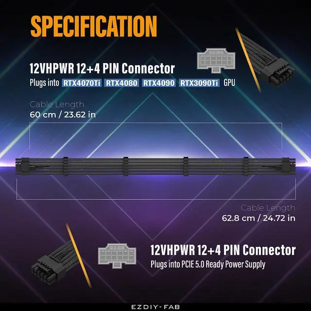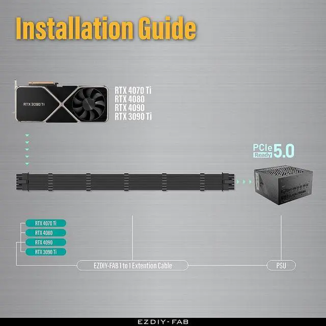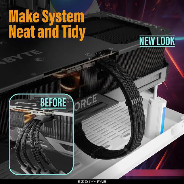 ^^ This cable is compatible with Modular Power Supplies featuring 12VHPWR/12V-2x6 power ports (search for PCIE 5.0 Ready PSU). It only requires a single 16-pin power cable to directly power the GPU from the PSU. This simple setup promotes tidiness and prepares you for the future of power delivery. ^^ Please note that the GPU sleeved extension cable is not suitable for 12pin GeForce RTX 30' Series GPU. Only support 12+4pin female GPU like RTX 50 Series (RTX 5080, 5070), RTX 4080 Super, RTX 4080, RTX 4090 and 40' series. Not recommended work for RTX5090.