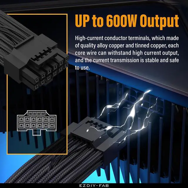 Dedicated design for the specs of 12VHPWR PCIe 5.0 Graphics Card, Connect to RTX3090ti/4090/4080/4070ti/other 40' series GPU without hassle, connecting to PCIe 5.0 Ready PSU to get a stable and reliable performance. Supports RTX 50 series GPUs (except RTX 5090, not recommended). ^^ The cable material is made of 16AWG tinned copper, and the terminal is made of alloy copper, providing support for a maximum output of 600W, stable performance and safety under high-load use, no frame drop, no screen flickering, and continuous power supply. ^^ Featured with 5 pcs of pre-installed cable comb, the appearance of the cable is well-organized, allowing you to easily achieve clean cable management and unified design.