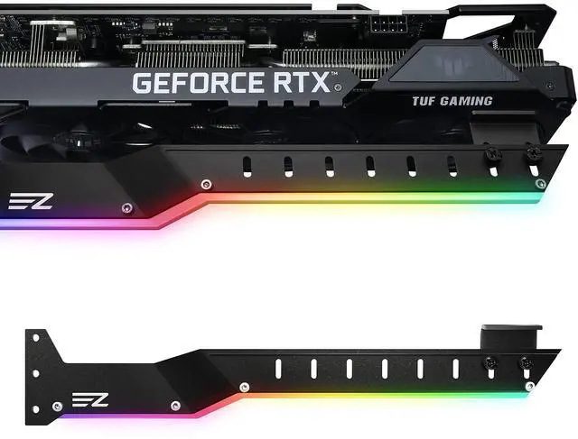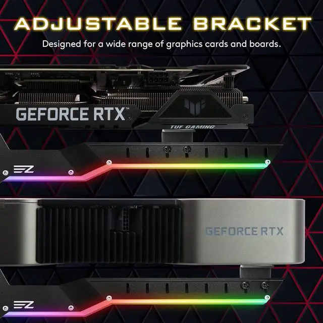 Lengthened and Bending shape design for latest big GPU, Supports Nvidia RTX 3000 AMD RX5000/6000 series, Only fits PC case with 7 or more-PCI Slot. ^^ Use sturdy aluminium alloy as the main structure to keep in lightweight and provide strong support. Prevents GPUs from bending and sagging after long period of use. ^^ The universal design of the support arm offers easy adjustment to fit a high range of graphics card and PC case combinations. ^^ Two kinds of rubber pad included, design for different cooling fan spacing of GPU. ^^ Featuring with 5V 3pin ARGB LED lights, Control and change the colors by connecting to Motherboard or by other ARGB controller.