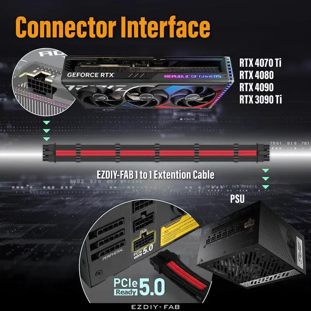 ^^ This cable is compatible with Modular Power Supplies featuring 12vhpwr power ports (search for Pcie 5.0 Ready PSU). It only requires a single 16-pin power cable to directly power the GPU from the PSU. ^^ Please note that the GPU sleeved extension cable is not suitable for 12pin GeForce RTX 30' Series Gpu. Only support 12+4pin female GPU like RTX 3090Ti, RTX 4080, RTX 4090 and 40' series.