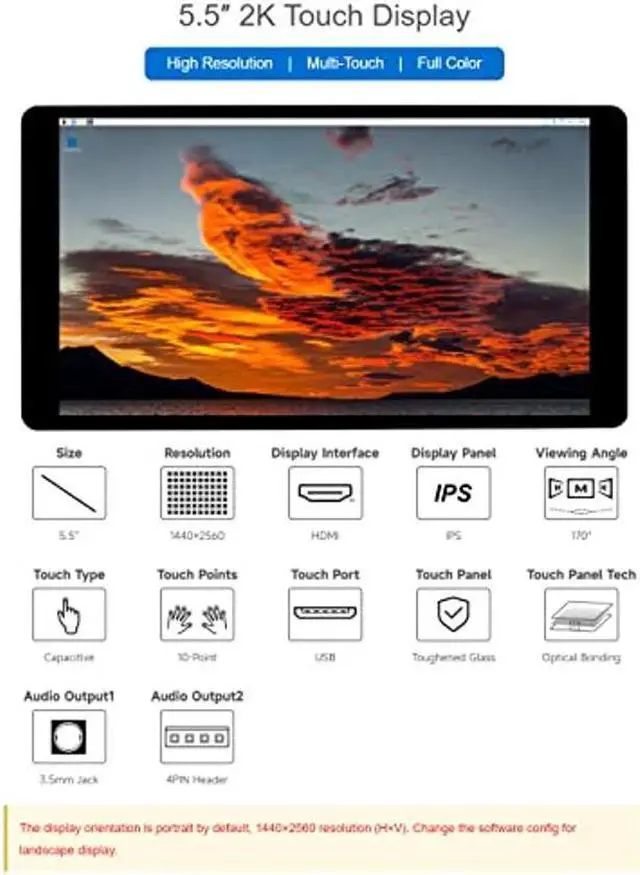 waveshare 5.5inch 2K Capacitive Touch LCD Display Compatible with Raspberry Pi 4B/3B+/Pi 3B/Zero 2w/Zero w and CM4 Supports Windows 11/10/8.1/8/7 Comes with Case