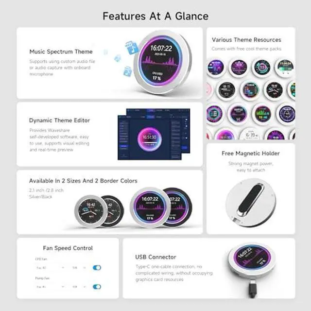 waveshare 2.8inch CPU/GPU Cooler Round LCD Display, AIO Computer Temp Monitor for Water Cooling Systems, PC Sensor Panel for PC Computer Accessories in Side Prebuilt Gaming PC Parts, Silver