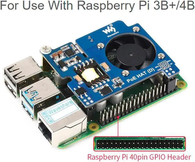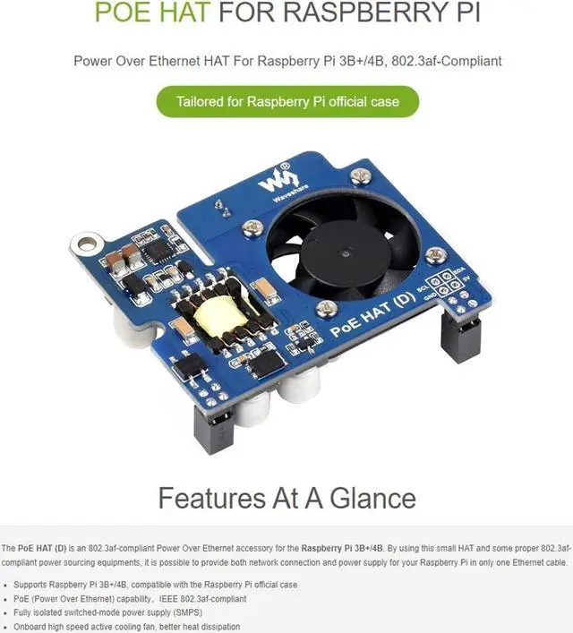The PoE HAT (D) is an 802.3 af-compliant Power Over Ethernet accessory for the Raspberry Pi 3B+/4B. By using this small HAT and some proper 802.3 af-compliant power sourcing equipments, it is possible to provide both network connection and power supply for your Raspberry Pi in only one Ethernet cable.