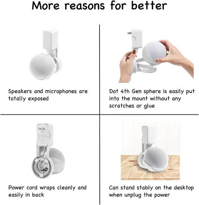 EASY TO INSTALL: No drilling holes or screwing. The installation can be completed in a few minutes. Dot 4th Gen sphere can be easily put into the mount without any scratches or glue. Great for kitchens, living rooms, bedrooms, and bathrooms.