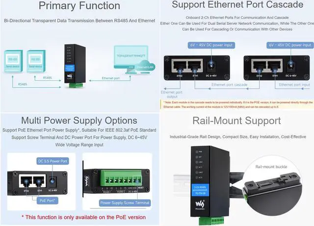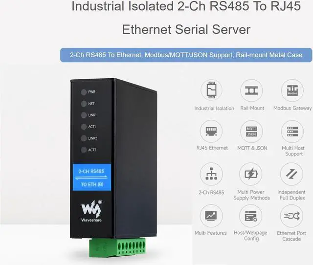 2-Ch RS485 to RJ45 Ethernet Serial Server, Dual channels RS485 independent operation, Dual Ethernet Ports, Rail-mount Industrial Isolated Serial Module, Bi-directional Transparent Transmission.