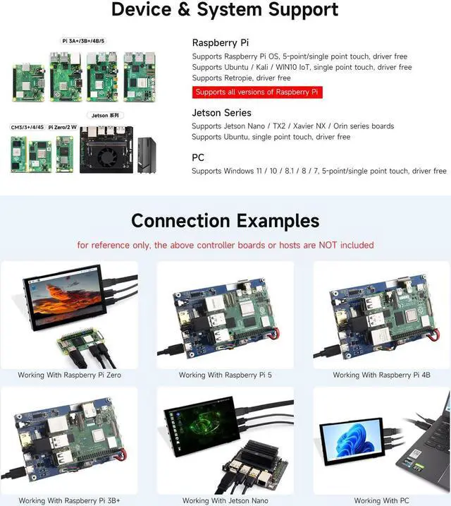 [(Device & System Support)] Supports all versions of Raspberry Pi. Supports Jetson Nano / TX2 / Xavier NX / Orin series boards. Supports Ubuntu, single point touch, driver free. Supports Windows 11 / 10 / 8.1 / 8 / 7, 5-point/single point touch, driver free