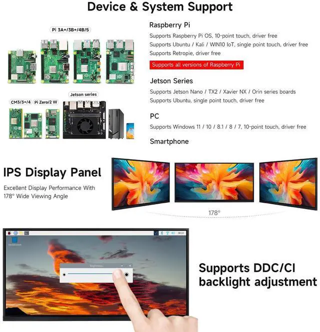Supports all versions of Raspberry Pi. Supports Jetson Nano / TX2 / Xavier NX / Orin series boards. Supports Windows 11 / 10 / 8.1 / 8 / 7, 10-point touch, driver free