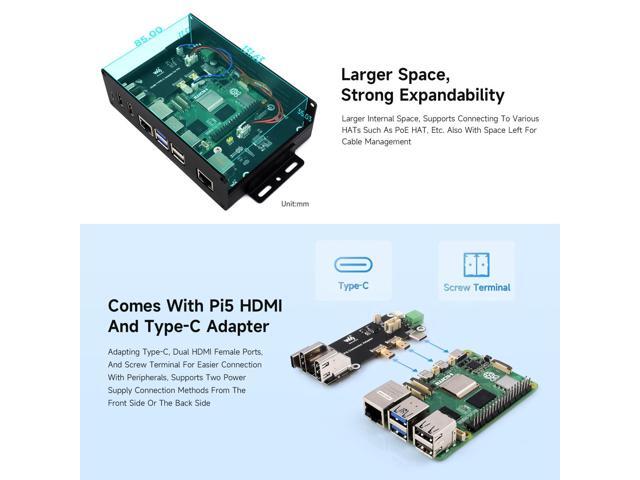 - Adapting Type-C, dual HDMI female ports, and screw terminal for easier connection with peripherals, supports two power supply connection methods from the front side or the back side