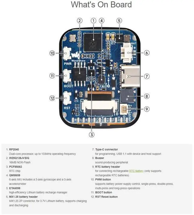 RP2040-Touch-LCD- 1.69 is a low-cost, high-performance MCU board designed by Waveshare. Tiny size with onboard 1.69 inch capacitive touch display, Li-ion