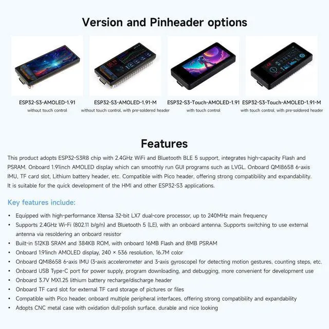 Built-in 512KB SRAM and 384KB ROM, with onboard 16MB Flash and 8MB PSRAM. Onboard 1.91inch AMOLED display, 240 x 536 resolution, 16.7M color