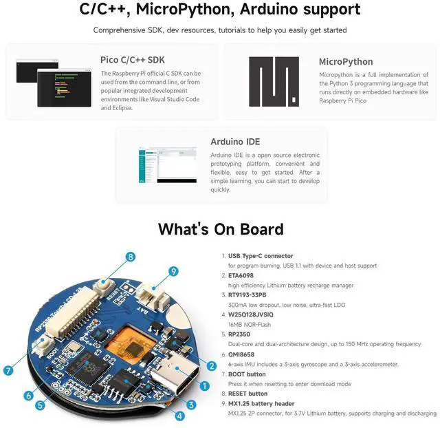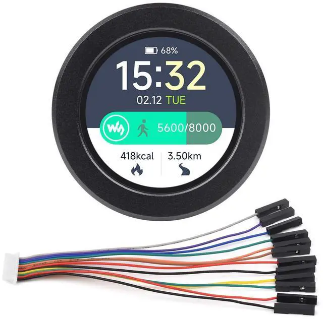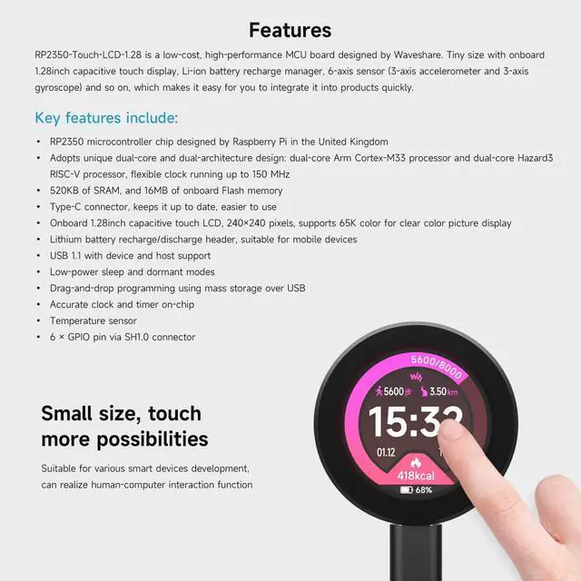 520KB of SRAM, and 16MB of onboard Flash memory. Type-C connector, keeps it up to date, easier to use. Onboard 1.28inch capacitive touch LCD, 240×240 pixels, supports 65K color for clear color picture display
