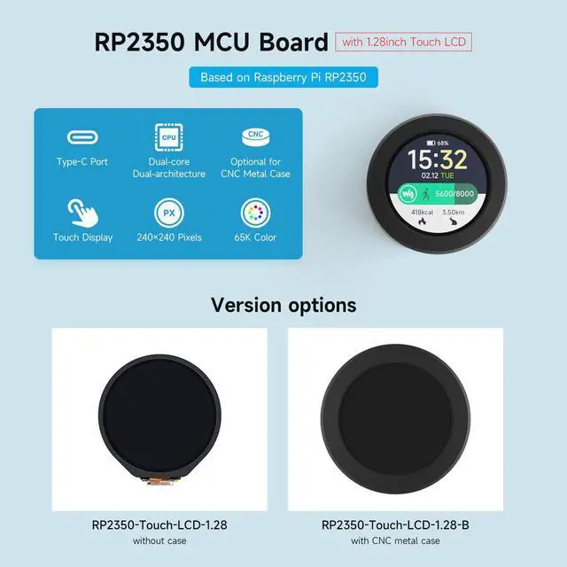Waveshare RP2350 MCU Board, with 1.28 inch Round Touch LCD, Dual-core & Dual-Architecture Design, 240×240 Pixels, 65K Color, IPS Panel, with Case