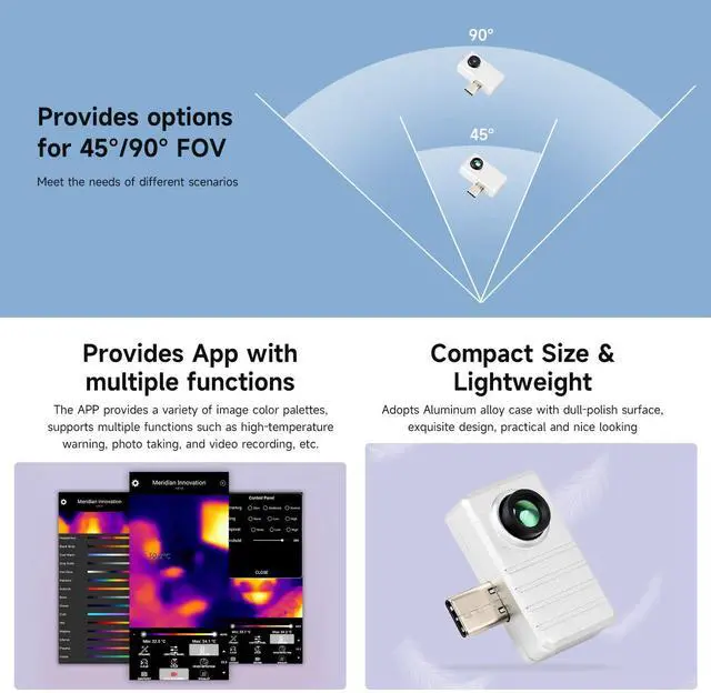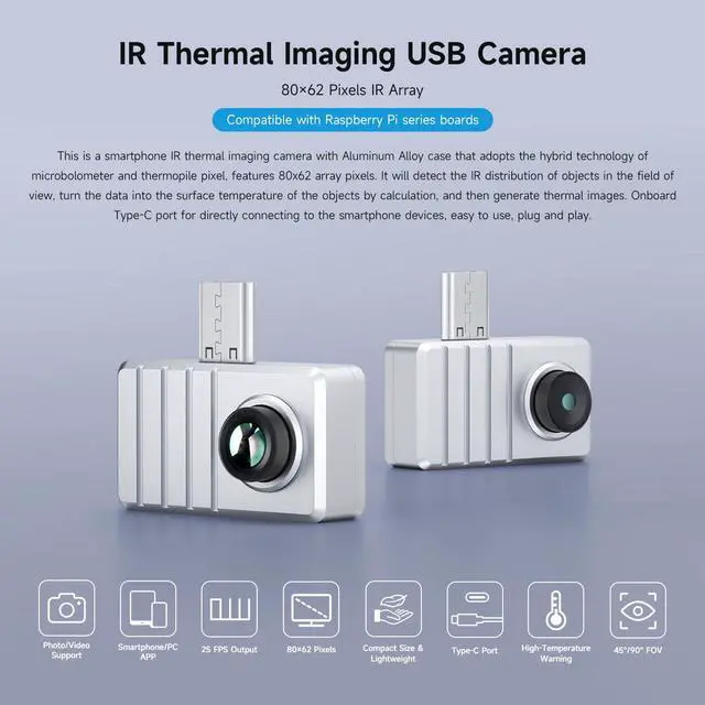 This is a smartphone IR thermal imaging camera with Aluminum Alloy case that adopts the hybrid technology of microbolometer and thermopile pixel, features 80x62 array pixels.