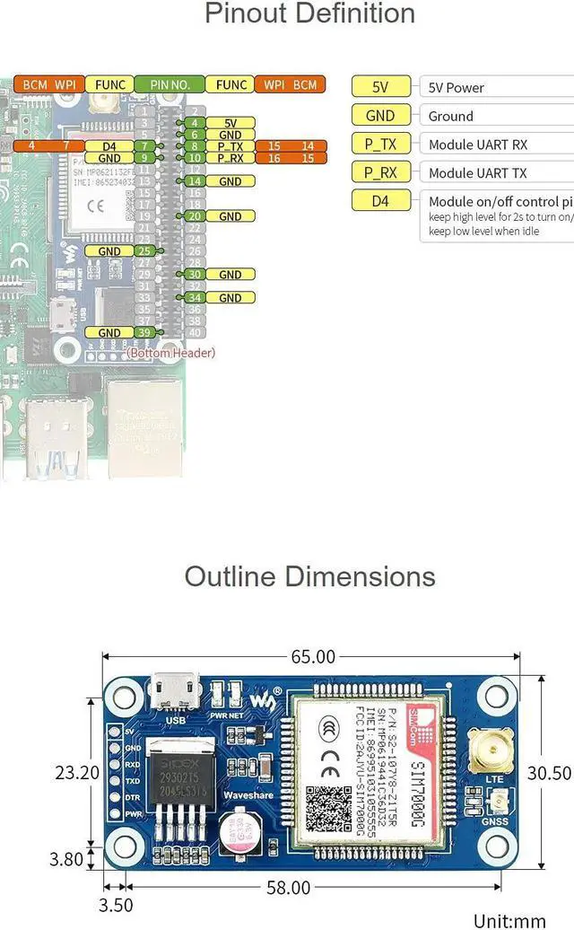 Standard Raspberry Pi 40PIN GPIO extension header, supports Raspberry Pi series boards. Supports TCP, UDP, PPP, HTTP, FTP, MQTT, SMS, Mail, etc.