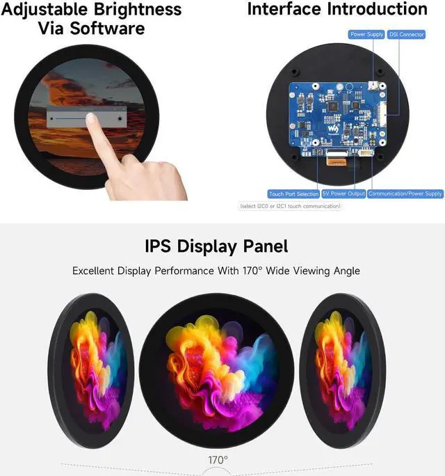 waveshare 4inch DSI Round Touch Display, 720 × 720 Resolution, IPS, 10-Point Touch, Compatible with Raspberry Pi 5/4B/3B+/3A+, CM3/3+/4, 170° Wide Viewing Angle