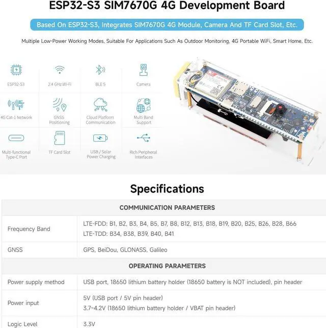 Waveshare ESP32-S3 SIM7670G 4G Development Board, LTE Cat-1 / WiFi/Bluetooth/GNSS Positioning Support, Global Coverage Multi Band, Suitable for 4G Portable WiFi, Onboard Camera/Antenna