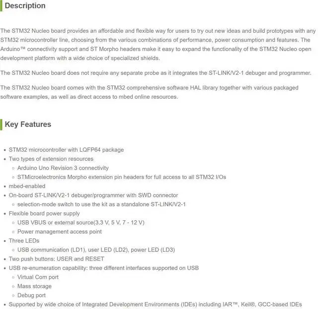 The STM32 Nucleo board comes with the STM32 comprehensive software HAL library together with various packaged software examples, as well as direct access to mbed online resources.