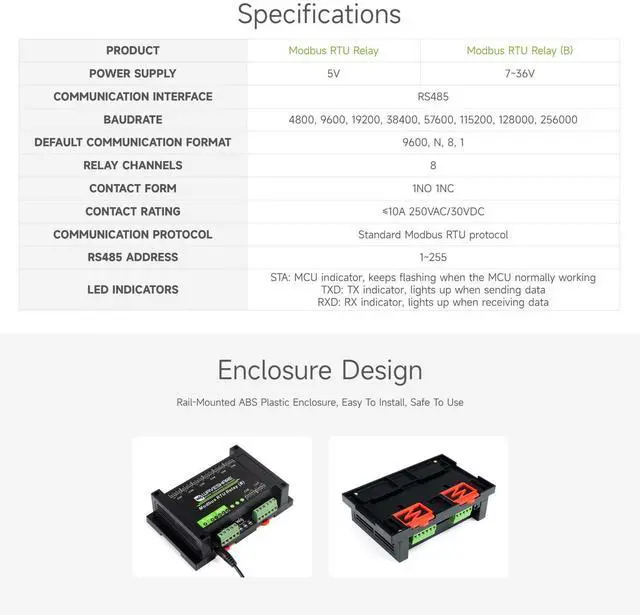 Waveshare Industrial Modbus RTU 8-Ch Relay Module (B) with RS485 Interface, Multi Isolation Protection Circuits, 7~36V Power Supply