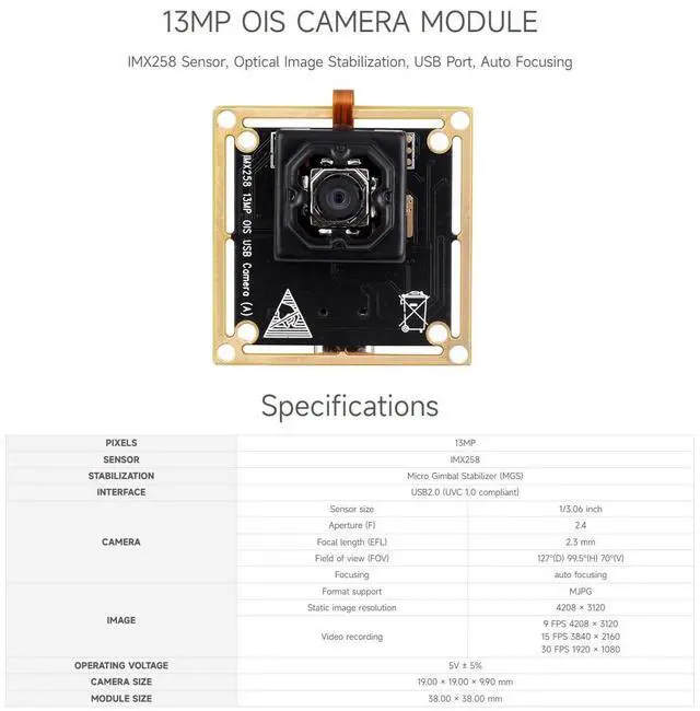 waveshare IMX258 13MP USB Camera Optical Image Stabilization Plug-and-Play No Driver Required Auto Focusing