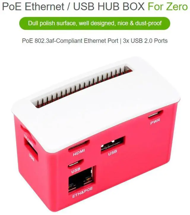 The PoE-ETH-USB-HUB-BOX is a HUB kit with Waveshare PoE/ETH/USB HUB HAT inside. It is tailored for Raspberry Pi Zero series, small in size, each cut-out of the case is exactly aligned with the connector. The case adopts classic Raspberry Pi red/white color combination, with quality dull polish surface, effectively keeping the Zero away from dust. By using this small HUB BOX and some proper 802.3 af-compliant power sourcing equipments, it is possible to provide both network connection and power supply for your Raspberry Pi Zero in only one Ethernet cable, along with 3x extended USB ports.