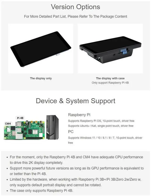 The display orientation is portrait by default, 1440×2560 resolution (H×V). Change the software config for landscape display. For reference only, Raspberry Pi 4B and CM4 are not included