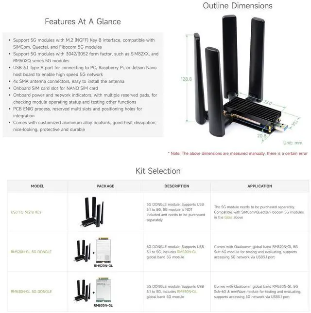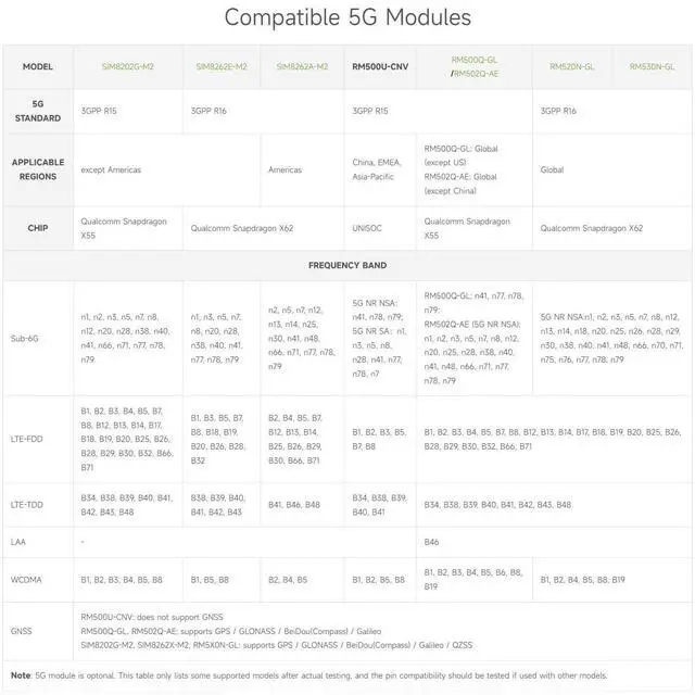 • Support 5G modules with 3042/3052 form factor, such as SIM82XX, and RM50XQ series 5G modules