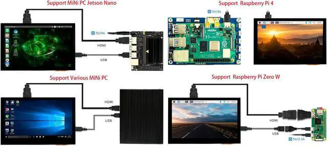 When works with Raspberry Pi, supports Raspbian/Ubuntu/Kali/Retropie/WIN10 IOT, driver free, When work as a computer monitor, supports Windows 10/ 8.1 /8/7, five-points touch, and driver free.