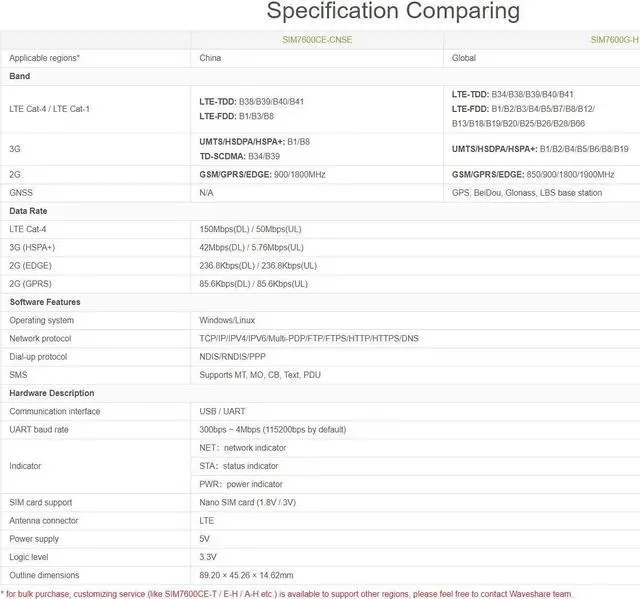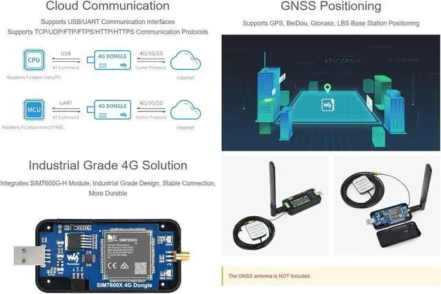 Onboard UART port with hardware flow control, for connecting with host boards like Arduino/STM32 Onboard GNSS connector, supports GPS, Beidou, Glonass, LBS base station positioning (additional GNSS antenna is required but NOT included)