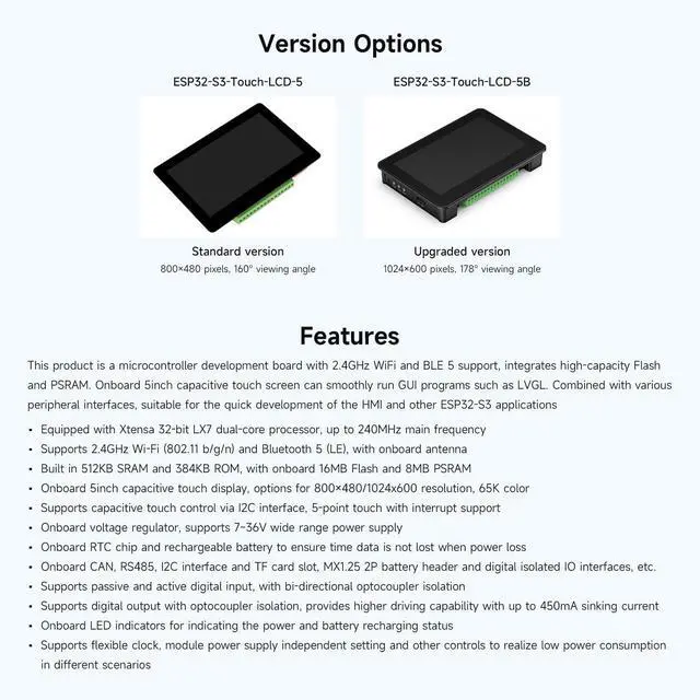 Built in 512KB SRAM and 384KB ROM, with onboard 16MB Flash and 8MB PSRAM Onboard 5inch capacitive touch display, options for 800×480/1024x600 resolution, 65K color
