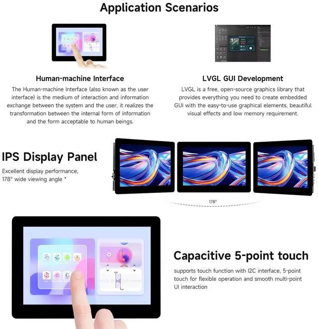 Supports capacitive touch control via I2C interface, 5-point touch with interrupt support Onboard voltage regulator, supports 7~36V wide range power supply