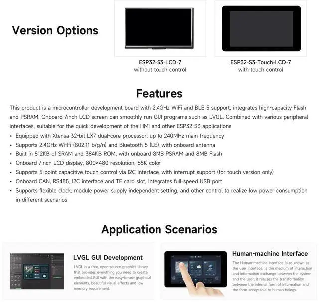 [Various Peripheral Interfaces] Combined with various peripheral interfaces, suitable for the quick development of the HMI and other ESP32-S3 applications. Supports flexible clock, module power supply independent setting, and other control to realize low power consumption in different scenarios