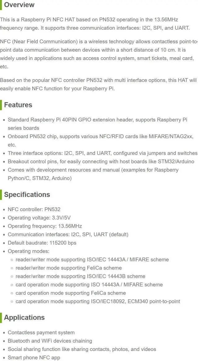 NFC and RFID Support: The PN532 NFC HAT supports both NFC (Near Field Communication) and RFID (Radio Frequency Identification) technologies, enabling versatile applications such as contactless payments, access control, and more.