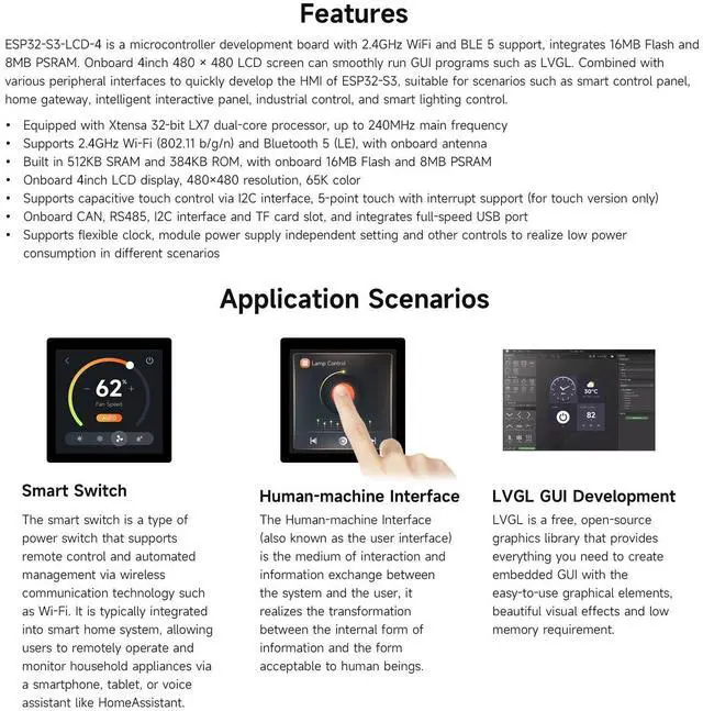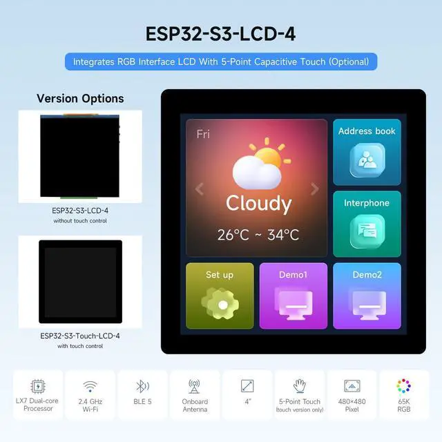 High-Resolution LCD Display: The onboard 4-inch LCD screen offers a resolution of 480×480 pixels and supports 65K colors, enabling smooth GUI program operation, including popular frameworks like LVGL. It's ideal for creating interactive displays in embedded applications.