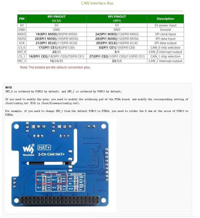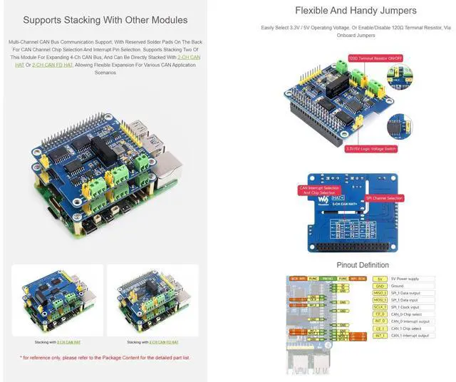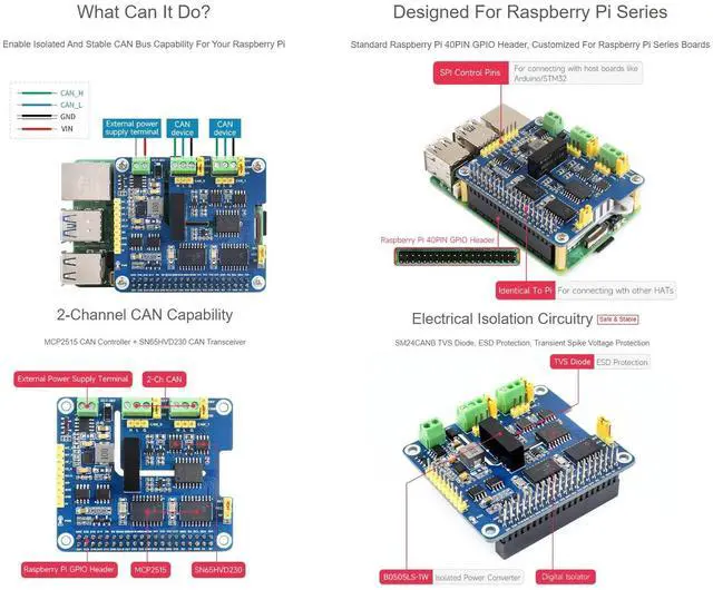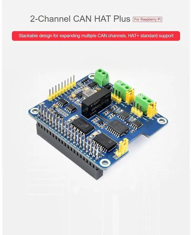2-Channel Isolated CAN Bus Expansion HAT For Raspberry Pi, Dual Chips Solution, Stackable Design For Expanding Multiple CAN Channels Features At A Glance The 2-CH CAN HAT+ is a 2-Channel CAN bus expansion HAT designed for Raspberry Pi. Supports expanding multiple CAN channels by stacking with the 2-CH CAN HAT or 2-CH CAN FD HAT. Adopts HAT+ standard design, compatible with Raspberry Pi series boards such as Raspberry Pi 5/4/3/Zero. Onboard various protection circuits, including electrical isolation to make communication more safe and reliable. Supports wide range voltage input of 736V, suitable for industrial applications.