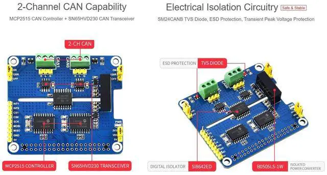 2-Channel Isolated CAN Bus Expansion HAT For Raspberry Pi 4 Model B/3B+/3B/2B/Zero/Zero W, MCP2515 + SN65HVD230 Dual Chips Solution, Multi Onboard Protection Circuits