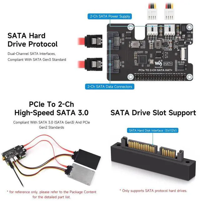 Waveshare PCIe to 2-Ch SATA Adapter, Compatible with Raspberry Pi 5, Supports SATA Hard Drive Protocol, Onboard Dual LED Indicators and EEPROM, HAT + Standard, Driver-Free, Plug and Play